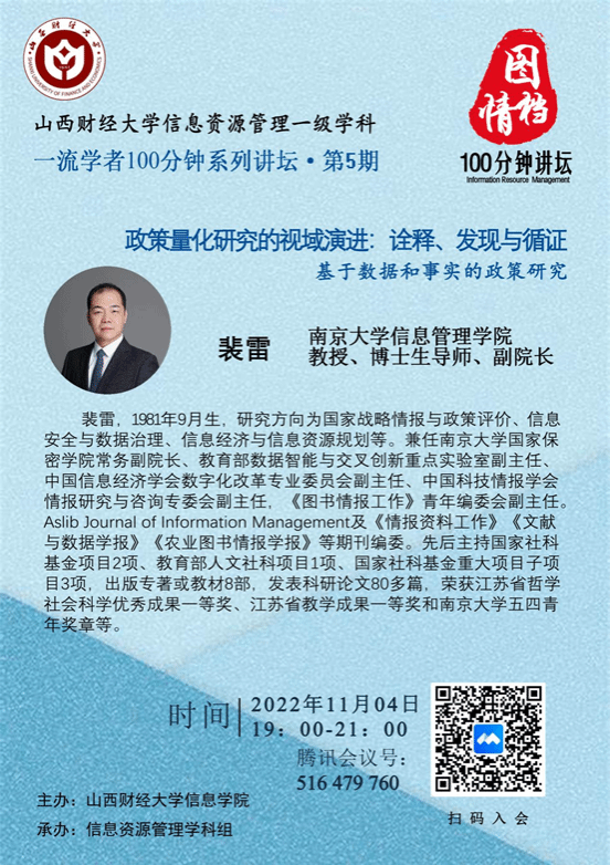主讲人:裴雷,1981年9月生,南京大学信息管理学院教授、博士生导师,副经理,研究方向为国家战略情报与政策评价、信息安全与数据治理、信息经济与信息资源规划等。兼任南京大学国家保密学院常务副经理、教育部数据智能与交叉创新重点实验室副主任、中国信息经济学会数字化改革专业委员会副主任、中国科技情报学会情报研究与咨询专委会副主任,《图书情报工作》青年编委会副主任。Aslib Journal of Information Management及《情报资料工作》《文献与数据学报》《农业图书情报学报》等期刊编委。先后主持国家社科基金项目2项、教育部人文社科项目1项、国家社科基金重大项目子项目3项,出版专著或教材8部,发表科研论文80多篇,荣获江苏省哲学社会科学优秀成果一等奖、江苏省教学成果一等奖和南京大学五四青年奖章等。
