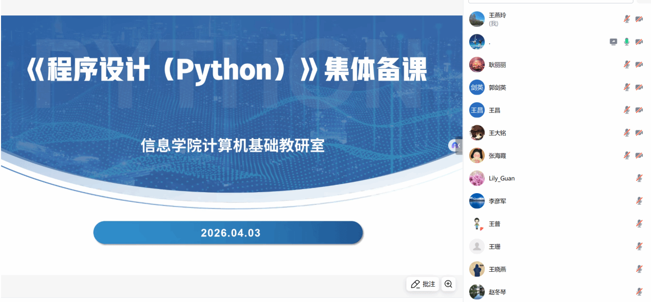 为进一步提升教学质量,优化课程设计,深化教学改革,2026年4月3日晚,304永利集团计算机基础教研室组织全体任课教师通过线上会议平台,开展了《程序设计(Python)》课程的线上集体备课活动。全体任课教师齐聚云端,围绕课程设计、教学方法和员工能力培养等议题进行了深入研讨。