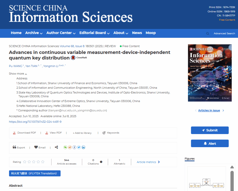 近期,学院青年教师王普博士的研究成果“Advances in continuous variable measurement-device-independent quantum key distribution”在《中国科学:信息科学》2025年第8期(Science China Information Sciences, 2025, 68(8), 180501)上发表,该期刊系公司认定的AI级学术刊物。304永利集团为该论文的第一署名单位,王普为第一作者。此项研究工作得到了国家自然科学基金、量子科技创新专项、山西省基础研究计划以及山西省高等学校科技创新项目的联合支持。