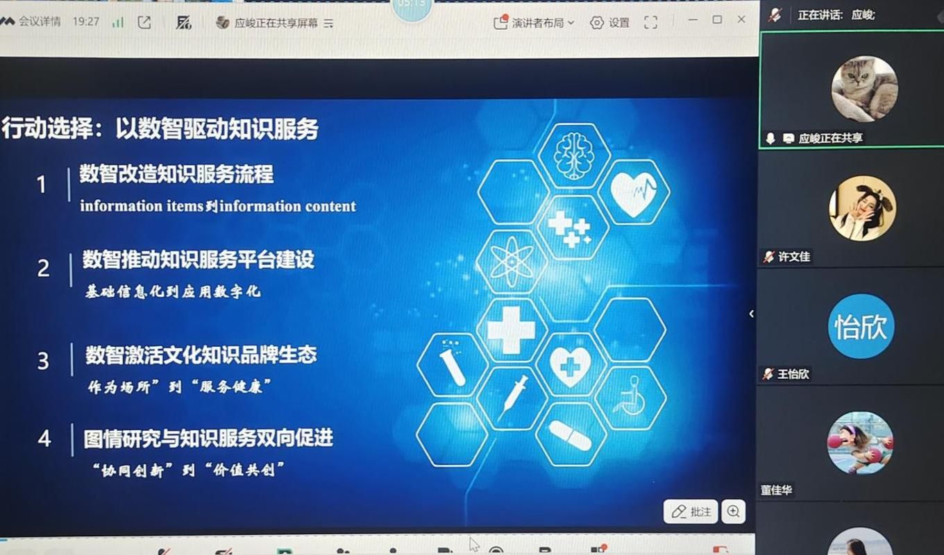 主讲人以“知识服务推动医学图书馆高质量发展”为主题,首先阐释了知识服务与传统信息服务的区别,强调知识服务以DIKW模型为理论基础,涵盖数据、信息、知识、智慧全层级,是取代信息服务的高阶形态。同时,主讲人深入分析了当前医学图书馆面临的多重挑战,如数字资源成本持续上涨、资源归属权界定模糊、传统业务流程难以满足高层次用户需求,以及在社会全面数字化背景下与咨询公司、数据库出版商的竞争压力等。其次,主讲人围绕医学图书馆转型发展路径,主讲人从数智改造知识服务流程、数智推动知识服务平台建设、数智激活文化知识品牌生态、图情研究与知识服务双向促进四个维度展开详细讲述。最后,主讲人指出,医学图书馆高质量发展的核心是服务理念升级与角色转型,即从传统“信息提供者”转变为用户科研创新“合伙人”,通过价值共创实现多方共赢。